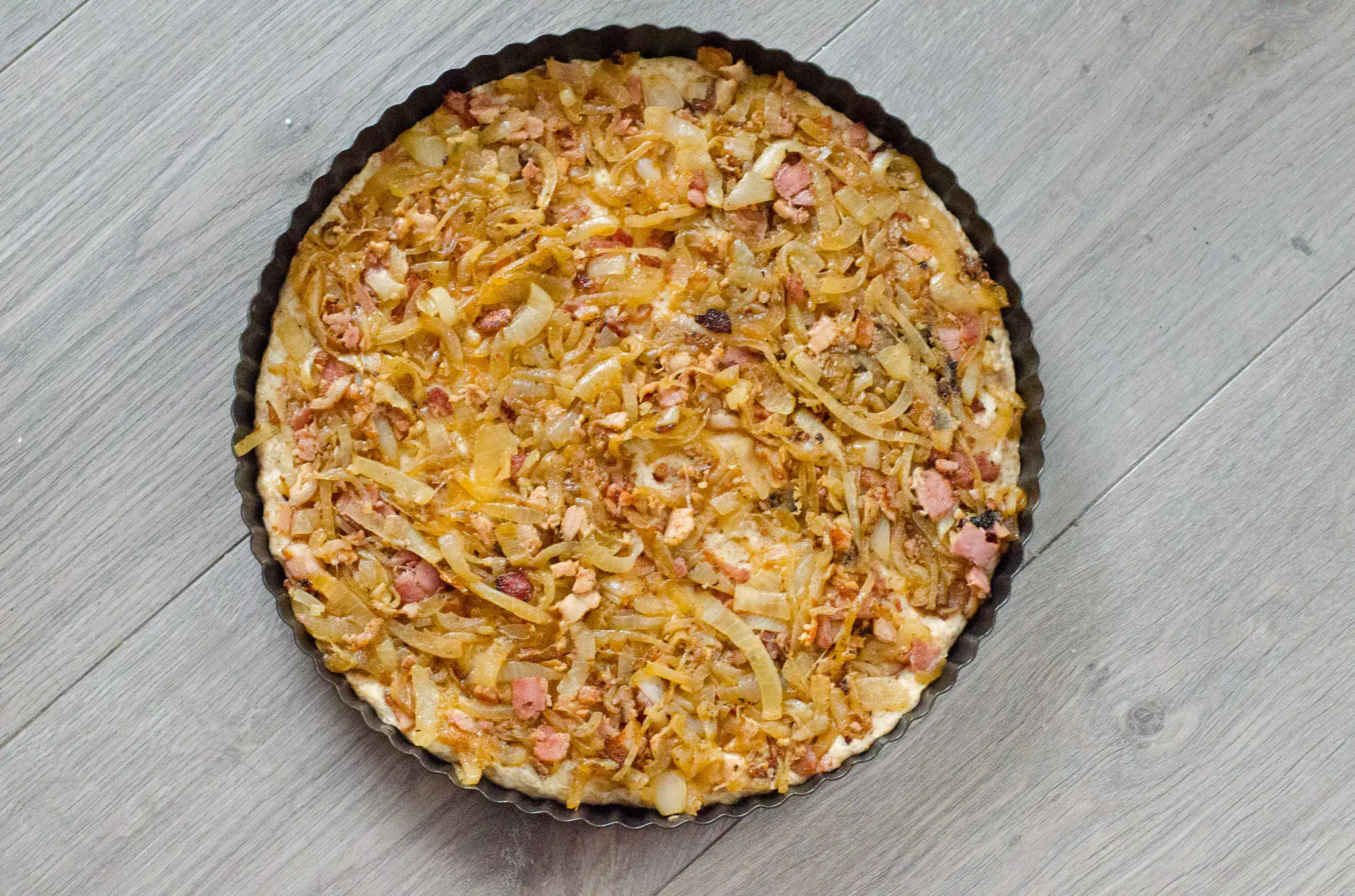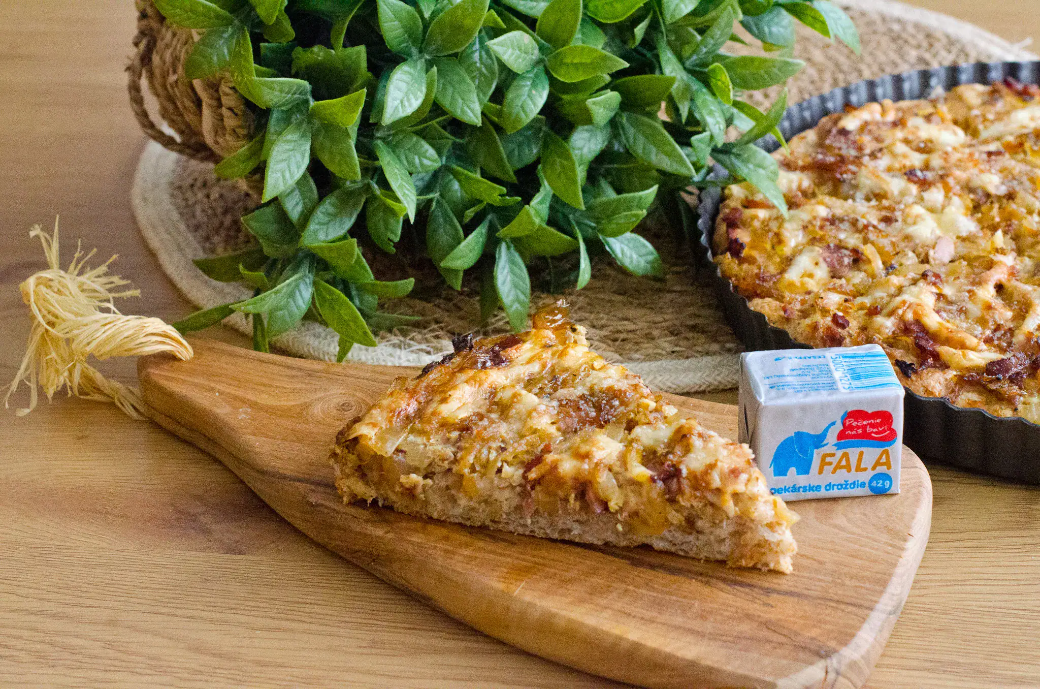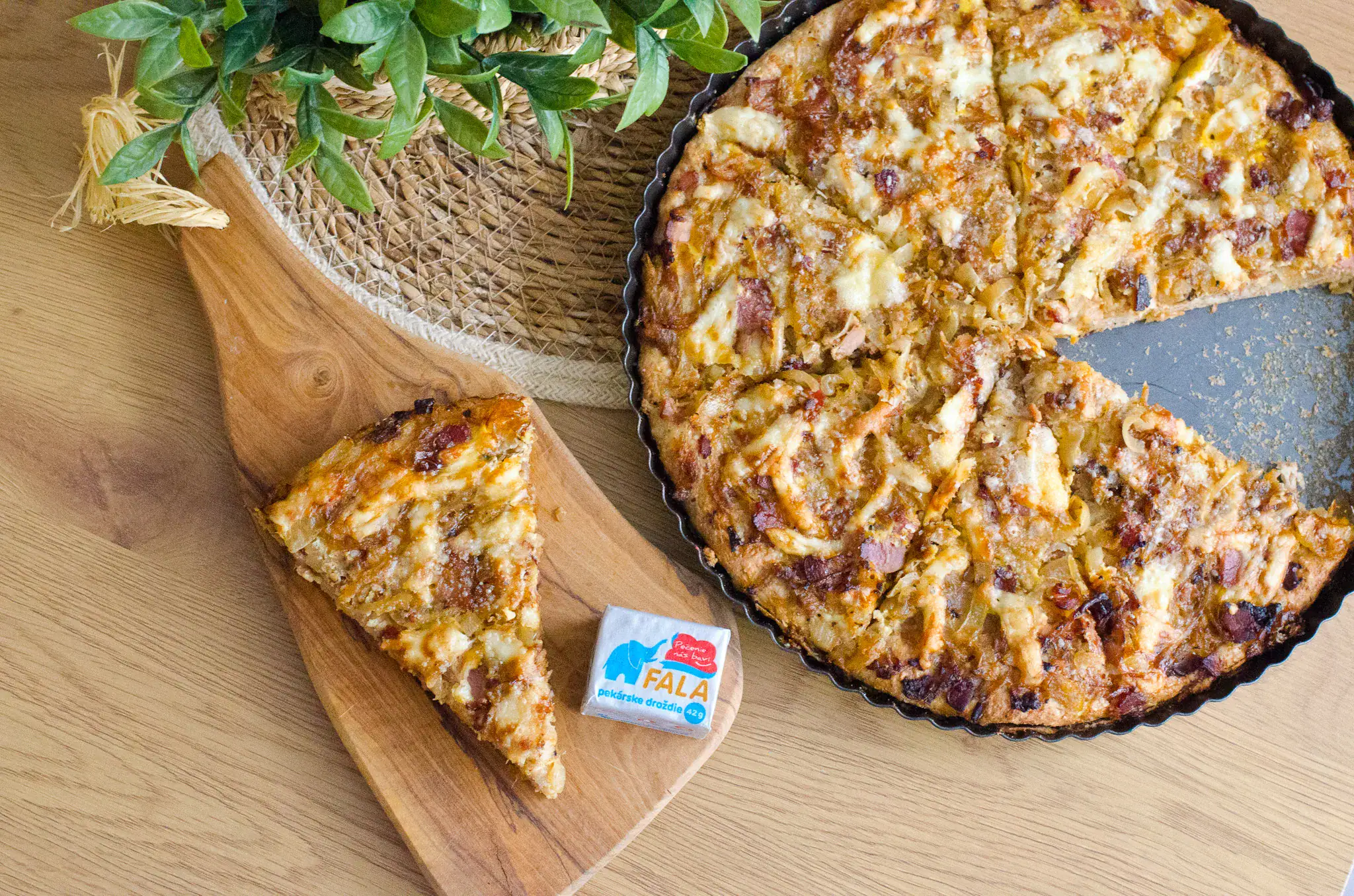 Vykysnuté cesto preložíme na vymastenú formu na pečenie. Rovnomerne naň poukladáme slaninku s cibuľou. Posypeme nastrúhaným tvrdým syrom a zalejeme mliekom s rozšľahaným vajíčkom.