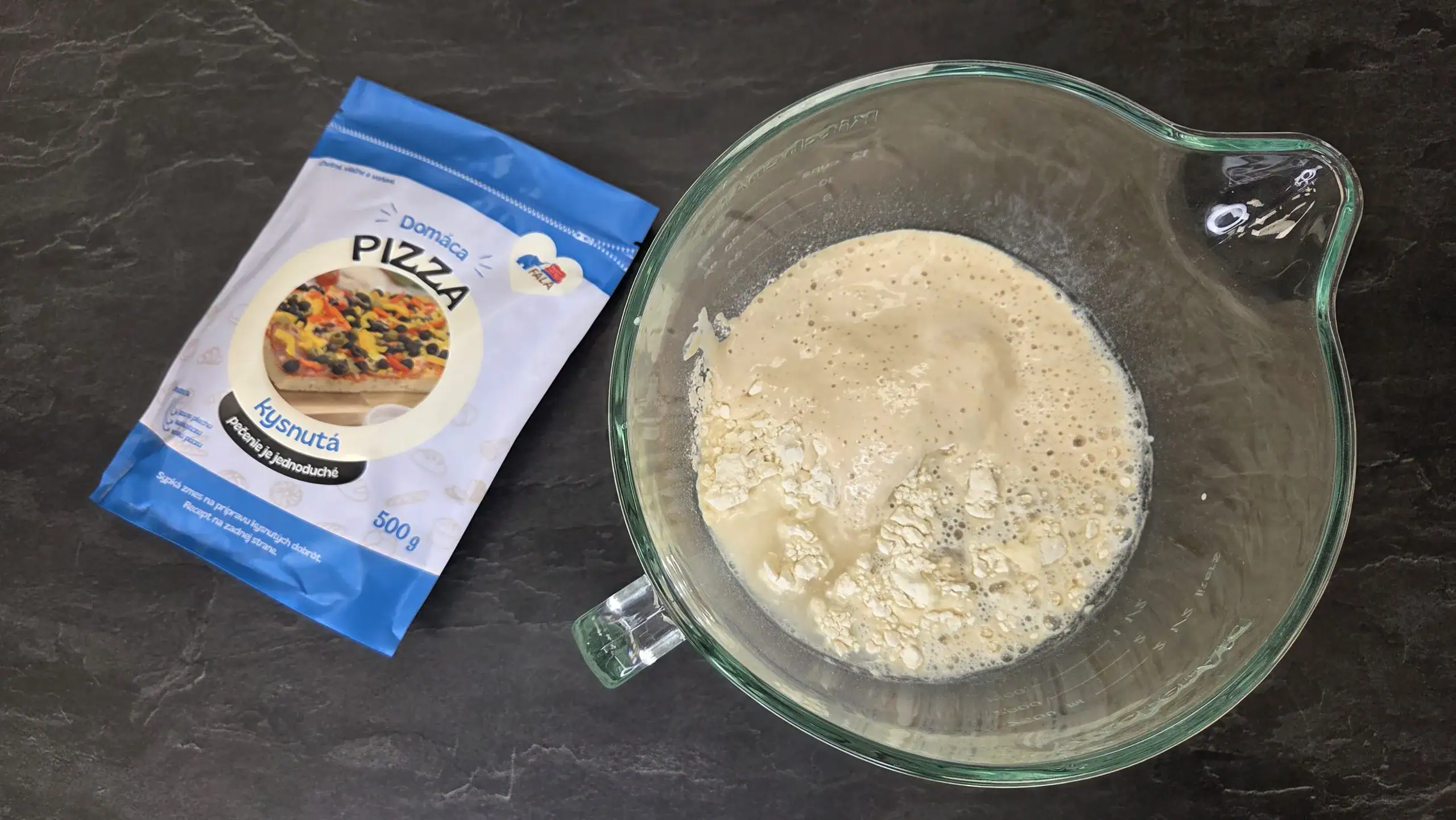 Odvážime si suroviny. V miske si zmiešame droždie FALA s 50 g vlažnej vody, pridáme lyžicu zmesi na Domácu pizzu a necháme postáť na teplom mieste 10 až 15 minút.