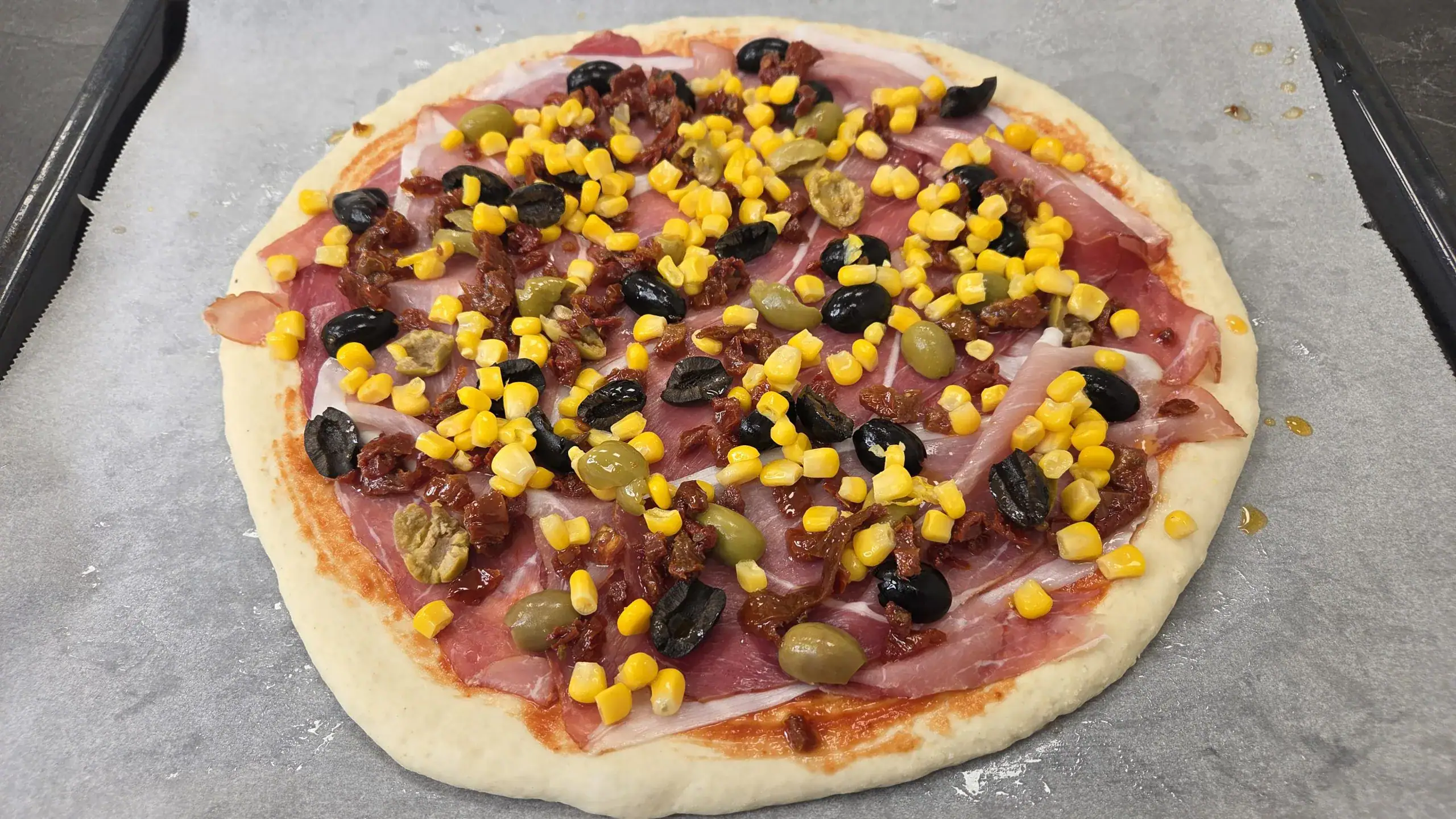 Po 2 hodinách si zoberieme bochník, opäť jemne premiesime, nechám postáť 10 minút a následne vyvaľkáme do kruhu, pričom cesto musí mať hrúbku približne 0,5 mm. Cesto preložíme na plech a na vrch pridáme ingrediencie podľa chuti.