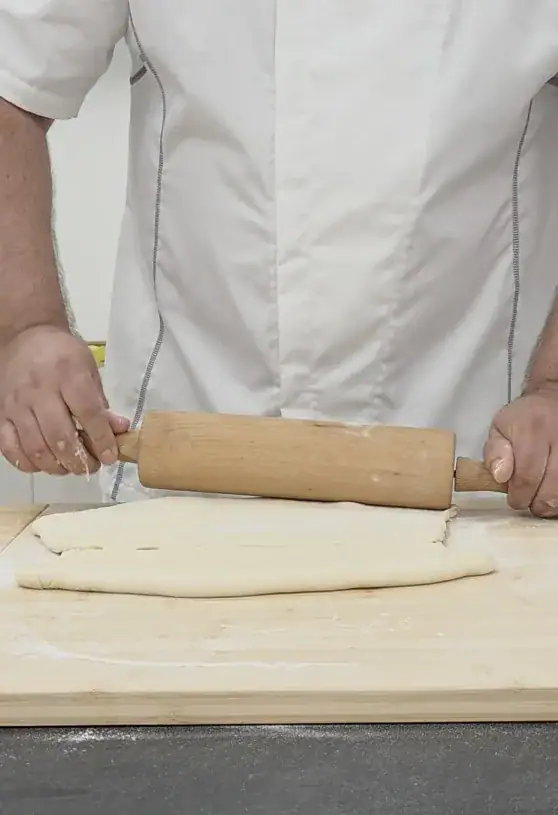 Potom preložíme cesto ešte na polovicu, čím nám vzniknú 4 vrstvy. Opäť si cesto vyvaľkáme do obdĺžnika, potrieme zvyšným maslom a celý proces prekladania zopakujeme.
